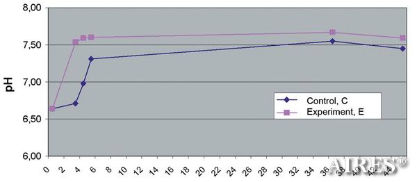 Время (сутки) Изменение значения pH воды в присутствии когерентного преобразователя Aires (Control, C – без микропроцессора Aires, Experiment, E – с микропроцессором Aires).