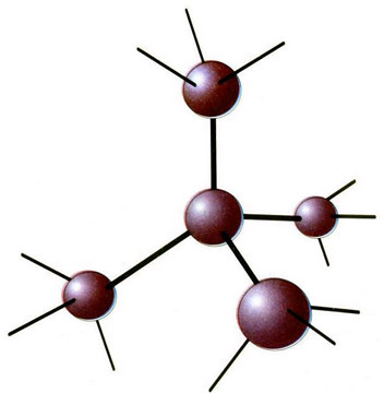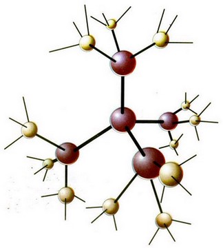 Рис. 2. Молекула воды, полностью реализовавшая свои центры образования водородных связей с окружающими четырьмя молекулами воды. У каждой из соседних молекул остаются нереализованными по три центра образования водородных связей.