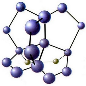 Рис. 6. Модель ассоциата воды из 57-и молекул. Тетраэдр из четырех додекаэдров ("квант"). Каждый из додекаэдров имеет 12 пятиугольных граней, 30 ребер, 20 вершин (в каждой соединяются три ребра, вершинами являются атомы кислорода, ребром служит водородная связь О-Н…О). Из 57-и молекул воды "кванта" 17 составляют тетраэдрический полностью гидрофобный (т.е. насыщенный четырьмя водородными связями) центральный каркас, а в четырех додекаэдрах на поверхности каждого находятся по 10 центров образования водородной связи (О-Н или О).