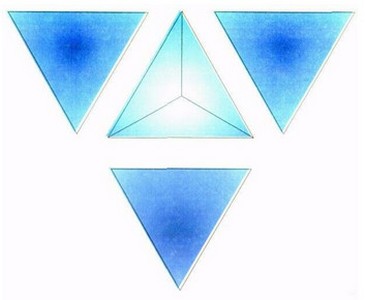 Рис. 8. Супертетраэдр пяти "квантов". 4 тетраэдра направлены в разные стороны от плоскостей центрального тетраэдра в виде "звезды". Три грани, направленные к наблюдателю, расположены в одной плоскости, образуя супергрань. Наложение этих плоскостей с перекрестным положением каждой грани невозможно.