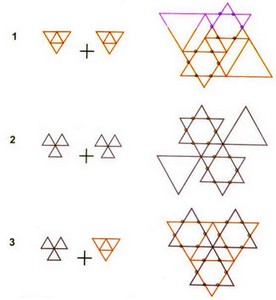 Рис. 10. Возможное комплементарное наложение суперграней: неполное для одного типа - "звезды" (1) или "снежинки" (2) и полное для суперграней разного типа - "звезды" и "снежинки" (3), т.е. образование триплета комплементарных шестицентровых связей. Супергрань "снежинки" расположена ближе к наблюдателю (выделена синим цветом), а супергрань "звезды" дальше от наблюдателя. Видно, что каждый треугольник грани "кванта" в "снежинке" находится в перекрестном положении с каждым треугольником грани "кванта" в "звезде". Кружками обозначено их пересечение, где происходит образование комплементарных связей.