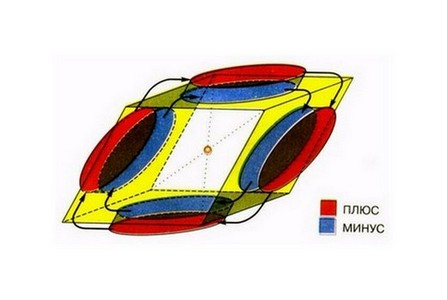 Рис. 15. Схематическое изображение областей положительных и отрицательных зарядов в структурном элементе воды. Стрелками показано движение этих зарядов при повороте структурного элемента относительно центра масс.