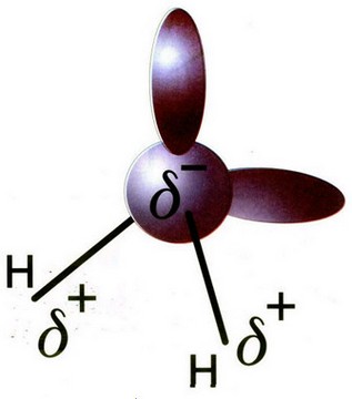 Рис. 1. Молекула воды. Обозначения δ - и δ + отражают распределение зарядов, характеризующих свойства полярности молекулы воды, а "лепестки" обозначают электронные облака двух неподеленных электронов атома кислорода.