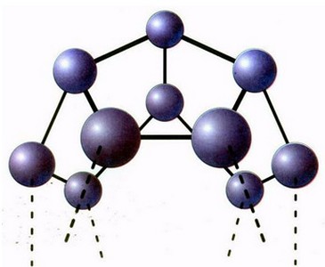 Рис. 6. Модель ассоциата воды из 57-и молекул. Тетраэдр из четырех додекаэдров ("квант"). Каждый из додекаэдров имеет 12 пятиугольных граней, 30 ребер, 20 вершин (в каждой соединяются три ребра, вершинами являются атомы кислорода, ребром служит водородная связь О-Н…О). Из 57-и молекул воды "кванта" 17 составляют тетраэдрический полностью гидрофобный (т.е. насыщенный четырьмя водородными связями) центральный каркас, а в четырех додекаэдрах на поверхности каждого находятся по 10 центров образования водородной связи (О-Н или О).