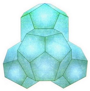 Рис. 12. Соединение одной шести и двух пятиквантовых фракций в структурный элемент воды. Разным цветом показано образование новых граней, включающих по 4 грани от "квантов".
