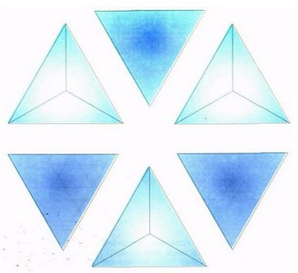 Рис. 8. Супертетраэдр пяти "квантов". 4 тетраэдра направлены в разные стороны от плоскостей центрального тетраэдра в виде "звезды". Три грани, направленные к наблюдателю, расположены в одной плоскости, образуя супергрань. Наложение этих плоскостей с перекрестным положением каждой грани невозможно.