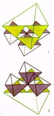 Рис. 11. Пространственная конфигурация разных фракций воды при их взаимодействии. Соединение супертетраэдра "звезды" и цикла "снежинки" происходит по схеме, указанной на рис. 10-3. Показано комплементарное взаимодействие "суперграней" при подходе "звезды" к "снежинке" сверху (1), и снизу (2), показывая возможность последующего тройного образования "звезда" - "снежинка" - "звезда".