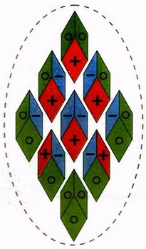 Рис. 15. Схематическое изображение областей положительных и отрицательных зарядов в структурном элементе воды. Стрелками показано движение этих зарядов при повороте структурного элемента относительно центра масс.